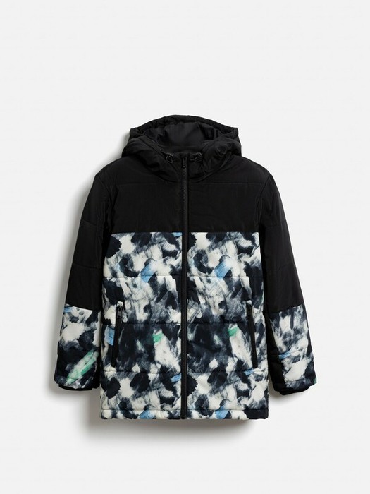 Утеплённая стеганая куртка с капюшоном для мальчика изготовлена из водонепроницаемой ткани, которой не страшны мелкий дождь, туман и сырость. Модель утеплена синтепоном (вес 200 гр/м2). Рекомендованный температурный режим от +10 до -10 градусов. Подкладка выполнена из стандартной гладкой подкладочной ткани. Спереди расположена застёжка на молнию с внутренней ветрозащитной планкой и защитой от защемления подбородка. Несъёмный капюшон с утяжкой и фиксаторами защитит ребенка от ветра и непогоды. Спереди располагаются два кармана на молнии, позволяющие держать нужные мелочи под рукой. По низу куртки расположена утяжка с фиксаторами для предупреждения продувания. Низ рукавов с трикотажными манжетами, обеспечивающими плотное прилегание и сохранение тепла. Принт в виде ярких мазков краски делает модель необычной и стильной. Рост модели 141 см, размер на модели 140.