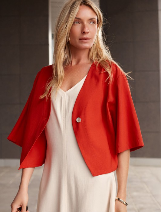 Состав: 70%Лиоцелл (Вис) 30%ПЭ Параметры модели на первом фото: Рост 172, бюст 88, талия 64, бедра 88Блузка свободного кроя в стиле кимоно выполнена из плотного лиоцелла. Модель со спущенным плечом и застежкой на одну пуговицу. Ткань изделия отлично держит форму, плавно драпируется и не просвечивает. В теплое время года приятно охлаждает кожу. Добавление синтетических волокон в составе изделия, предотвращает сминаемостьи поддерживает формоустойчивость. Блузка сочетается в костюме с брюками D24.261, D24.265, D24.267, шортами D28.057 и юбкой D24.261, а также очень эффектно с белыми шортами и джинсами.