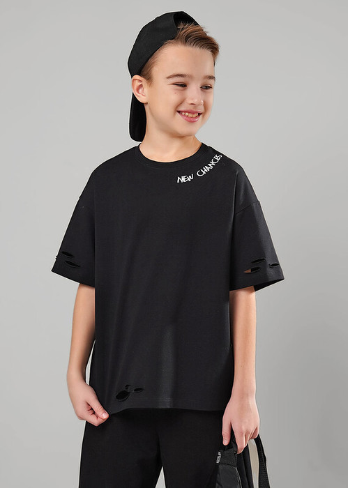 Хлопковая футболка кроя оверсайз - тренд сезона! Эластичная горловина,комфортная посадка по фигуре, акцентный принт. Для стильных и дерзких подростков- прорези. Сочетай футболку с любимыми шортами или брюками и будь на стиле!