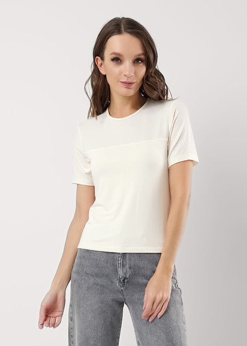 Футболка из трикотажного полотна с добавлением модала. Округлая горловина с окантовкой. Короткий втачной рукав. Спереди кокетка, нижняя часть переда двойная.