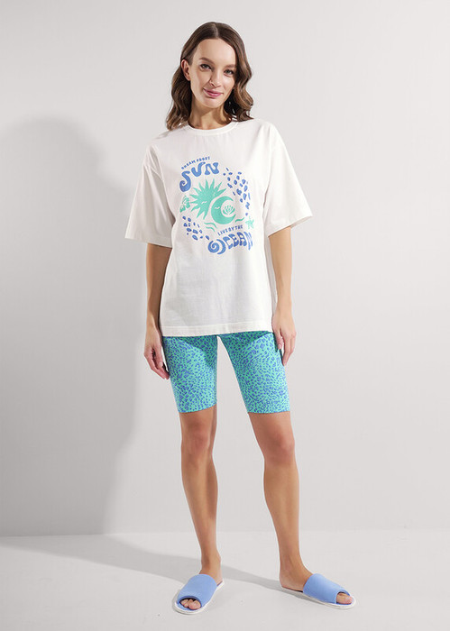 Набор одежды для дома и отдыха из трикотажного полотна. Футболка прямого силуэта из трикотажного полотна. Округлая горловина с обтачкой. Короткий втачной рукав. На полочке и спинке принт. Шорты с притачным широким поясом на резинке, принт.