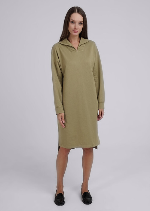 Платье прямого силуэта из трикотажного полотна - рибана с начесом, длиной до колена,боковые разрезы. Спущенная линия плеча, длинный рукав с манжетом. Фигурный вырез стойка. Сзади по спинке средний шов, нашивка.