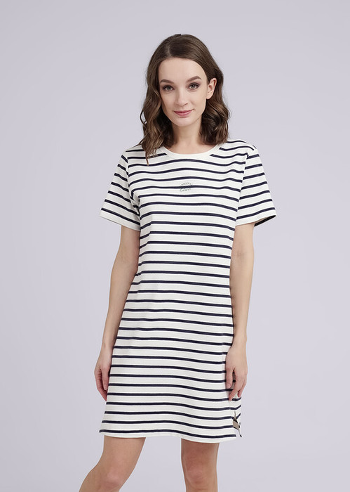 Платье для дома из трикотажного полотна рибана. Прямого силуэта, короткий втачной рукав. По бокам разрезы. На детали переда принт. Округлая горловина с обтачкой из рибаны.