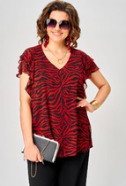 Блузка прямого силуэта из трикотажного полотна, с отложным воротником на стойке. Спереди цельнокроеная планка с застежкой на пуговицы. Длинный втачной рукав, внизу с притачной манжетой и застежкой на пуговицу. По спинке кокетка со складкой.