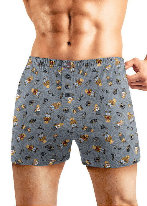 Боксеры комфортной посадки выполнены из оригинального полотна в авторскую графику ""гаражный"" медведь. Трусы дополнены пуговицами и жаккардовым логотипом.