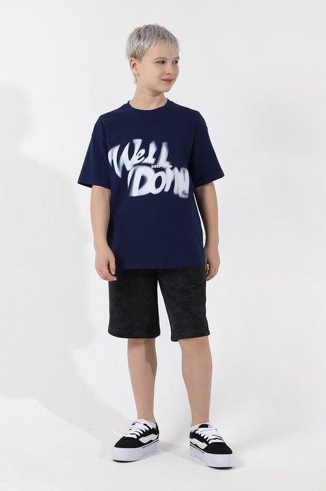 Футболка оверсайз для мальчика из трикотажного полотна: хлопкового с добавлением лайкры. Модель с принтом на переде, спущенной линией плеч, рукавами длиной до локтя.