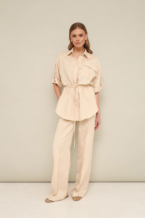 Льняной 2-предметный комплект актуального кроя, состоящий из блузки и брюк.