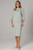Комплект из костюмной ткани на подкладке, состоящий из жакета и юбки. Жакет прямого силуэта с нагрудными вытачками и прорезными карманами с клапанами. Воротник - стойка. Рукава - реглан, длинные. Жакет застегивается на пришивные кнопки. Цветок ручной работы, расположение можно поменять самостоятельно. Юбка на подкладке, с отлетной деталью и поясом-обтачкой. В среднем шве заднего полотнища юбки - застежка-молния и разрез.