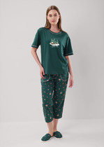 Пижама женская из вискозного трикотажного полотна с набивным рисунком, состоящая из футболки и брюк. Футболка – прямая, с короткими втачными рукавами. Полочка с V – образными кружевными деталями по горловине.Брюки - свободного покроя с эластичной тесьмой по талии.