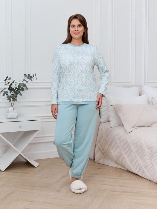 Пижама женская из трикотажного полотна «микрофлис» в комбинации двух видов:с набивным рисунком и гладкокрашеного в единой цветовой гамме, состоящая из футболки и брюк. Футболка - из полотна с набивным рисунком, классического покроя, с длинными втачными рукавами, горловиной овальной формы, обработанной втачной планкой. Низ изделия, горловина обработаны притачными планками из контрастного материала.Брюки – свободного покроя, с эластичной тесьмой по талии и нижним срезам.