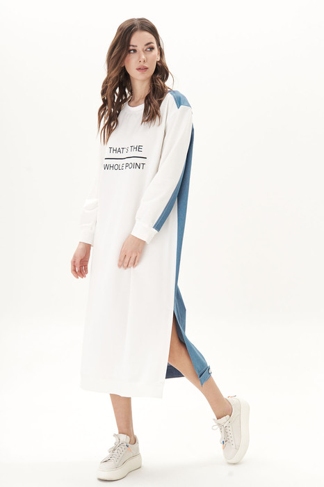 Модное платье - настоящее спасение для нерешительных. Не надо думать с чем сочетать, просто надеваешь и всё... Платье комбинированное, полочка и перед рукава трикотажные, спинка- джинсовая. Силуэт - оверсайз с заниженной линией плеча. покрой рубашечный. Полочка с декоративным принтом. Спинка с отрезной кокеткой, вертикальными рельефами и отрезным поясом с пуговицами-болтами. По боковым швам - разрезы. Рукав с отрезной локтевой частью из джинса.