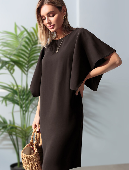 Состав: 69%ПЭ 23%Вис 8%Лиоцелл (Вис) Параметры модели на первом фото: Рост 172, бюст 88, талия 64, бедра 88Платье из плотного струящегося крепа прямого кроя с «парящими» рукавами. Фасон платья сбалансирует любой тип фигуры: прямой свободный крой, универсальная длина подола – чуть ниже колена, широкая пройма и акцентные рукава. Классический О-образный вырез фиксируется сзади изящной золотой пуговицей. Материал почти не мнется и комфортен в носке.