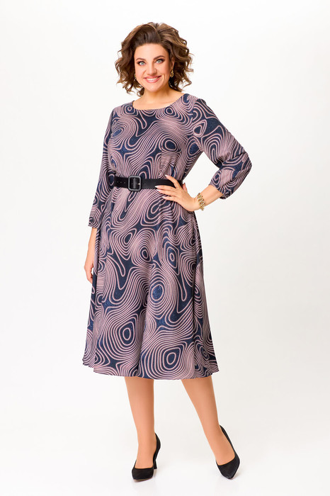 Платье из мягкой вискозной ткани, Х-образного силуэта, отрезное по линии талии. Перед и спинка лифа с талиевыми вытачками. Юбка расклешённая с карманами в боковых швах. В среднем шве спинки застёжка на потайную тесьму молнию. Горловина округлой формы, рукав втачной длиной 4/5, по низу собран на эластичную тесьму-резинку.
