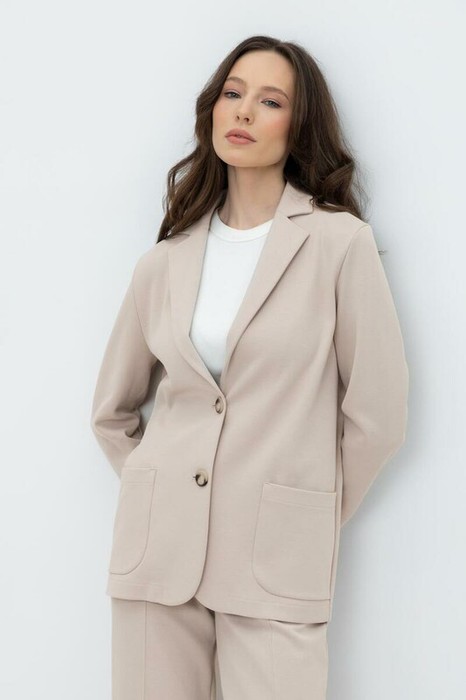 Женский жакет с карманами прямого кроя с застежкой на пуговицы и двумя накладными карманами из плотного гладкого трикотажа интерлок.
