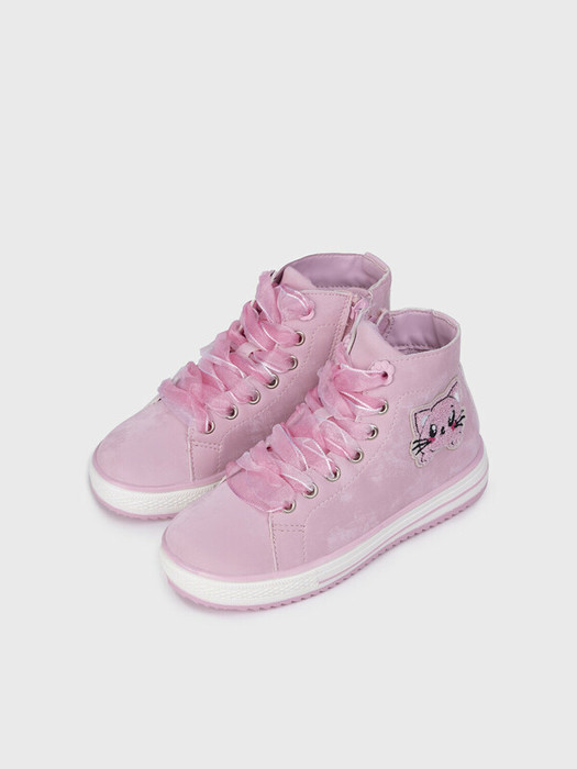 Кеды детские для девочки. Высокие кеды из искусственной кожи с милым пушистым патчем-котиком и бантом-шнурком из органзы. Модель имеет шнурки, с помощью которых регулируется подъем, и изнутри молнию для удобства обувания. В носочной части обуви стоит текстильная подкладка c высоким содержанием хлопка 80%, которая обладает высокой гигроскопичностью. В пяточной части обуви текстильная подкладка обладает хорошей износостойкостью. Профилированная стелька из свиной кожи с анатомической формой подсводника обеспечивает правильную нагрузку на стопу. Двухсоставная подошва из ТПР очень гибкая, не скользит,устойчива к истиранию. Формоустойчивый задник поддерживает стопу в правильном положении. Эргономичная форма колодки обеспечивает правильное формирование стопы ребенка.