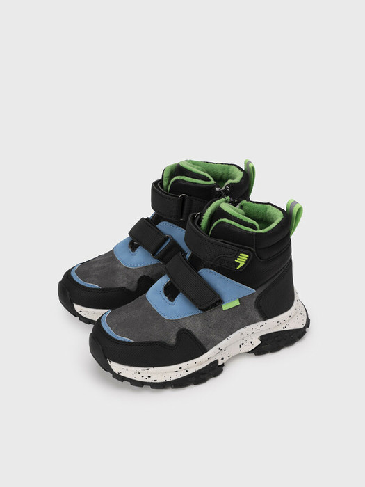 Ботинки детские утепленные спортивного стиля для мальчика. Верх обуви выполнен из водостойкой искусственной кожи с тиснением под джинсу и гладкой искусственной кожи. Носочная и пяточная часть усилены специальным защитным материалом. Ботинки имеют две липучки. С их помощью обувь регулируется на любой подъем. Для удобства обувания изнутри предусмотрена молния. Подкладка и съемная стелька выполнены из материала c высоким содержанием валеной шерсти 80% и обладают высокими теплозащитными свойствами. Формоустойчивый задник поддерживает стопу в правильном положении. Эргономичная форма колодки обеспечивает правильное формирование стопы ребенка. Двухсоставная подошва из терморезины очень гибкая, не скользит и устойчива к истиранию. Рекомендованный температурный режим носки от +10°С до -5°С.