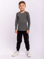 Лонгслив для мальчика из рибаныв графитовой расцветке. Верхний срез обработан швом в подгибку с предварительно притачанной резинкой. Рукава-реглан.
