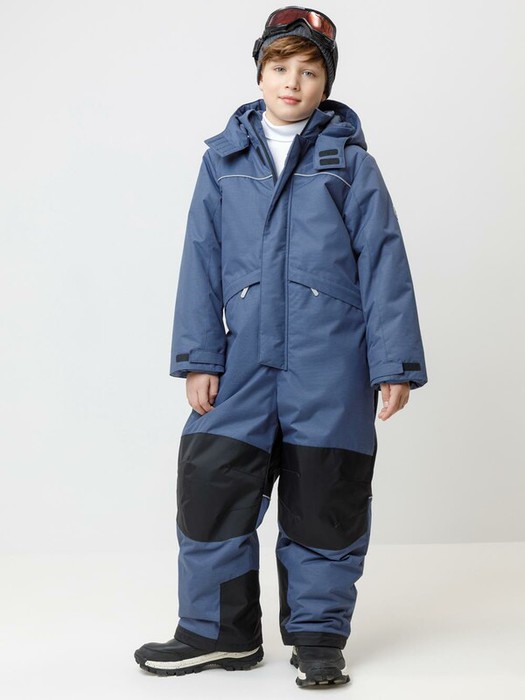 Зимний комбинезон для мальчика с утеплителем Fellex®: 250 г/м2 . Выполнен из мембранной ткани с дополнительной тефлоновой обработкой, которая предохраняет изделие от загрязнений и отталкивает влагу. Подклад выполнен из 100% полиэстера Tricot. Комбинезон застёгивается на молнию и внешнюю планку на липучках и кнопках, предусмотрена защита подбородка. Съёмный капюшон имеет эластичную резинку по бокам. Резинка по спинке обеспечивает лучшее прилегание. По бокам два кармана на молнии. На рукавах эластичные внутренние манжеты, ширина регулируется при помощи липучки. Внутренняя противоснежная юбка по низу изделия защищает обувь от попадания снега и удерживает комбинезон в закреплённом положении. В размерах с 98-104 по 116-122 предусмотрены отстёгивающиеся штрипки. Во всех изделиях верхнего ассортимента для безопасности ребёнка предусмотрены светоотражающие элементы.