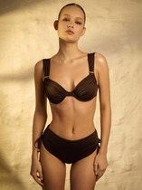 Лиф с уплотненными чашками и завязками на шее обеспечивает комфортную поддержку, визуально увеличивает объем и создает эффект идеально округлой груди. Трусы «слипы» с высокой линией талии и высоким вырезом бедра подчеркивают бедра и длину ног.