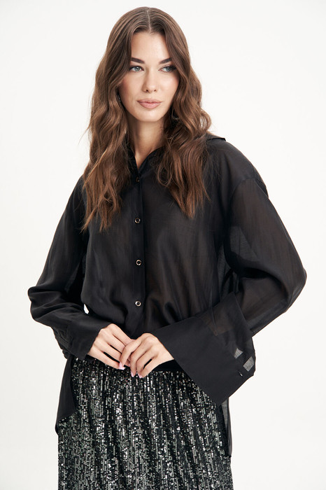 Свободная классического, рубашечного покроя, с цельной застёжкой и воротником-стойкой.Спинка с отрезной кокеткой и мягкой бантовой складкой. Рукав рубашечный с отрезной манжетой на застёжке.