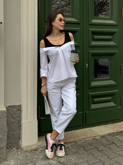 Комфортная туника свободного силуэта, выполнена из рубашечной ткани. Обработана (пришита) втавка в киде топа из эластичного трикотажа контрастного цвета.Воротник отложной спущен на предплечья.