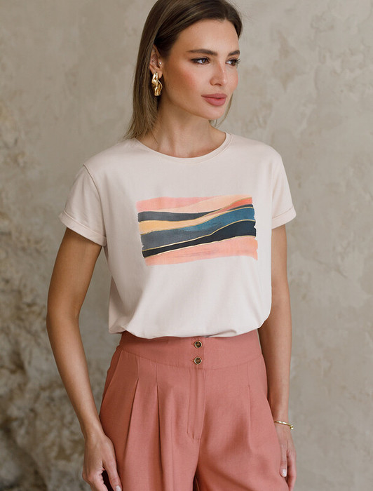 Совместные покупки Уфа Женская одежда Футболки — Акция Vilatte Футболка из эластичного хлопка с принтом стразы D49.097 бежевый_s