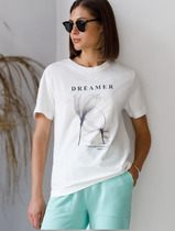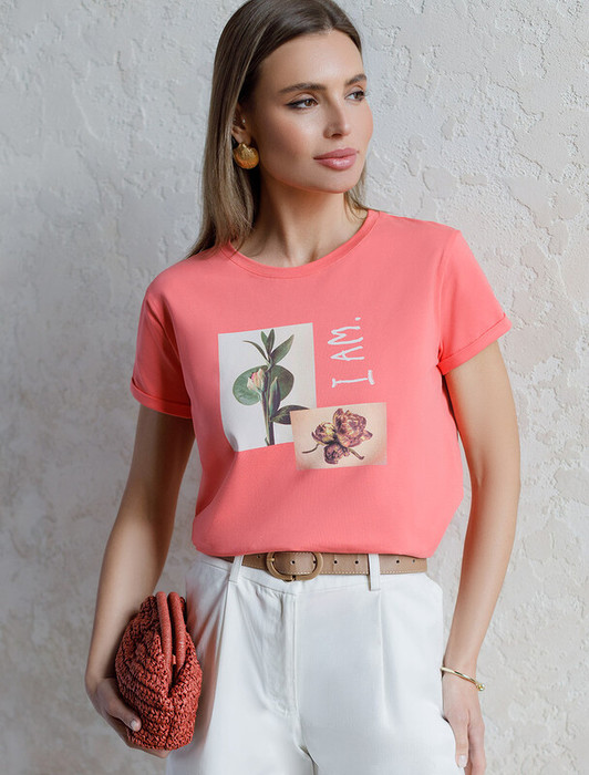 Совместные покупки Уфа Женская одежда Футболки — Акция Vilatte Футболка из эластичного хлопка с принтом стразы D49.097 коралловы