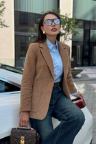 Жакет, укороченный прямого силуэта, двубортное с втачным двухшовным рукавом. Полочка с застежкой на петлю-пуговицу и имитацией кармана с клапаном. Спинка с центральным швом. Жакет с отрезным бочком, переходящим на полочку и на спинку. Воротник пиджачного типа с отрезной стойкой. Жакет на подкладке.