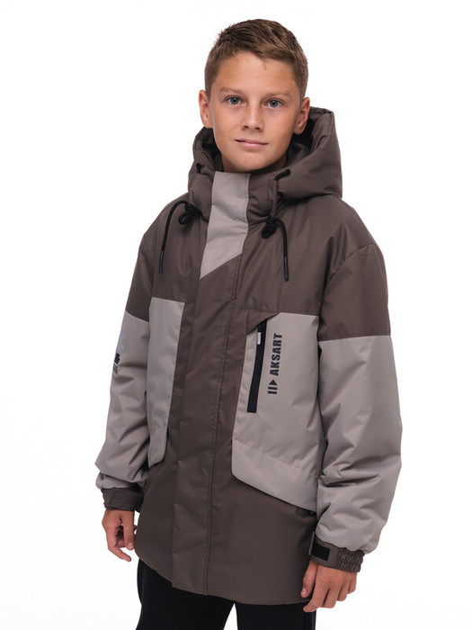 Удлиненная куртка из мембранной ткани с лаконичной черной фурнитурой. Удобная длина, скрывающая школьный пиджак. Центральные части полочек и рукава выполнены из отделочной ткани. На куртке 4 кармана. На левой полочке карман с вертикальным входом. Параллельно ему выполнен лаконичный накат. Под клапанами входы боковые карманы. Внутренний карман накладной на ленте «велькро». Фронтальная молния под ветрозащитной планкой. Ветрозащитная планка и клапаны карманов фиксируются потайными кнопками. Низ  рукавов дополнен манжетами на эластичной тесьме и патами с лентой «велькро». Капюшон несъемный. Регулировка лицевой части капюшона выполнена с помощью кулисы со шнуром. На правом рукаве эффектный термопринт.Характеристики:Ткань верха: Liverpool WR membraneПодклад: полибушет / п/э