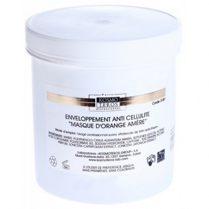 Антицеллюлитное гелевое обертывание. Основным активным компонентом Активной маски с горьким апельсином от Kosmoteros является композиция Kosmoslim, содержащая полифенолы горького апельсина, кофеин и витамин Е. Учитывая, что двумя главными причинами формирования целлюлита являются сохранение триглицеридов в жировых клетках и нарушение микроциркуляции и лимфооттока в подкожно-жировой клетчатке, Kosmoslim создан в виде комплексной композиции, которая активизирует процесс липолиза и обеспечивает дренажную функцию в организме. В свою очередь активизация липолиза путём расщепления жировых клеток приводит к выделению большого количества неэстерифицированных жировых кислот. Высокая концентрация (5%) композиции Kosmoslim позволяет маске в рамках специальных салонных процедур успешно решать проблемы локальных жировых отложений, активизировать вывод излишков жидкости из проблемных зон и стимулировать обменные процессы в тканях.