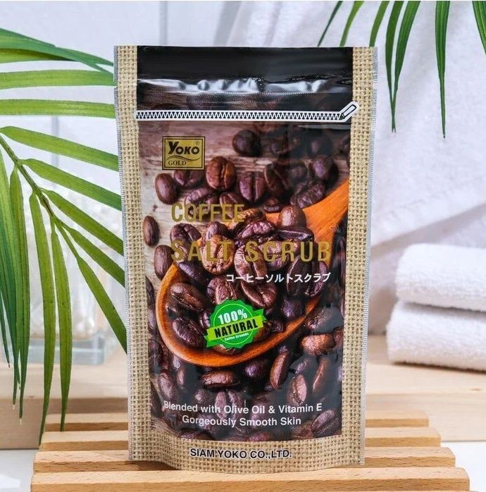 СПА-скраб для тела Yoko не вызывает раздражения, хорошо смывается, эффективно действует и имеет приятный аромат, делает кожу непревзойденно мягкой и эластичной.Имеет антицеллюлитный эффект. Натуральный солевой скраб для тела из Таиланда Yoko создан на основе Морской соли и мелких частичек натурального кофе.Скраб позволяет проделать эффективные спа-процедуры в домашних условиях.Скраб эффективно удаляет ороговевшие клетки кожи, выводит токсины, активизирует обмен веществ.Скраб с морской солью и кофе является замечательным средством для борьбы с целлюлитом, помогает избавиться от эффекта "апельсиновой корки". Выравнивает тон кожи.Эффективно омолаживает кожу, делает ее гладкой, шелковистой и сияющей.Кофе способствует ускоренному расщеплению жиров и усиливает обменные процессы, кожа становится бархатистой и упругой.Витамин Е и оливковое масло в составе увлажняют кожу после пилинга.Морская соль обогащает клетки кожи полезными минералами и микроэлементами, такими, как: железо, йод, магний, повышает тонус кожи, делает ее мягкой гладкой и эластичной.Способ применения: разотрите небольшое количество скраба в ладонях. Легкими круговыми движениями помассируйте влажную кожу. Через 3 минуты смойте теплой водой. Использовать скраб лучше всего вечером, после принятия ванны или душа. Для усиления эффекта, тело рекомендуется слегка распарить.