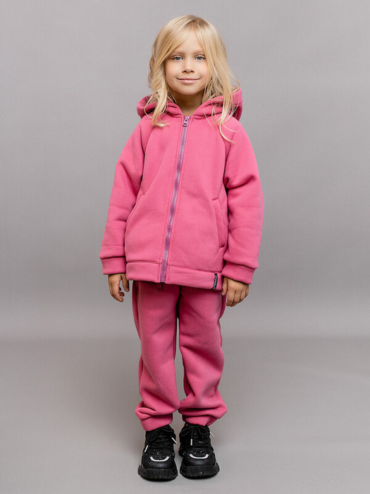 Комплект спортивный из футера с начесом розовый для девочек: толстовка на молнии и брюки. Ткань не линяет, не выцветает. Толстовка с карманами, глубоким капюшоном и эластичными манжетами рукавов. Брюки с поясом на резинке и утяжке шнурком, карманами и эластичным низом. Удобный базовый комплект одежды. Характеристики:Ткань верха: футер 3-х нитка с начесом65% хлопок, 35% полиэстерПроизводитель: Batik