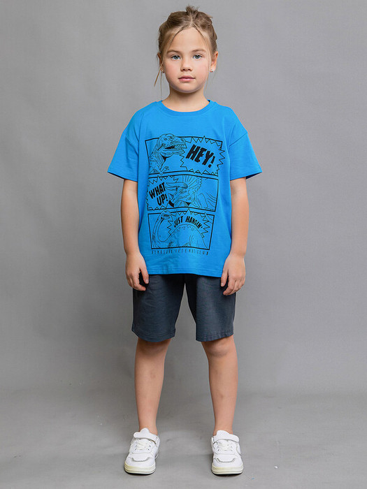 Комплект (футболка + шорты) для мальчика трикотажный из супрема пенье. Синяя футболка с коротким рукавом и рисунком "комиксы" и шорты. Спортивный комплект для детей из качественного хлопка с эластаном.Характеристики:Ткань: супрем пенье 92% хлопок 8% эластан / ткацкое полотноПроизводитель: batik