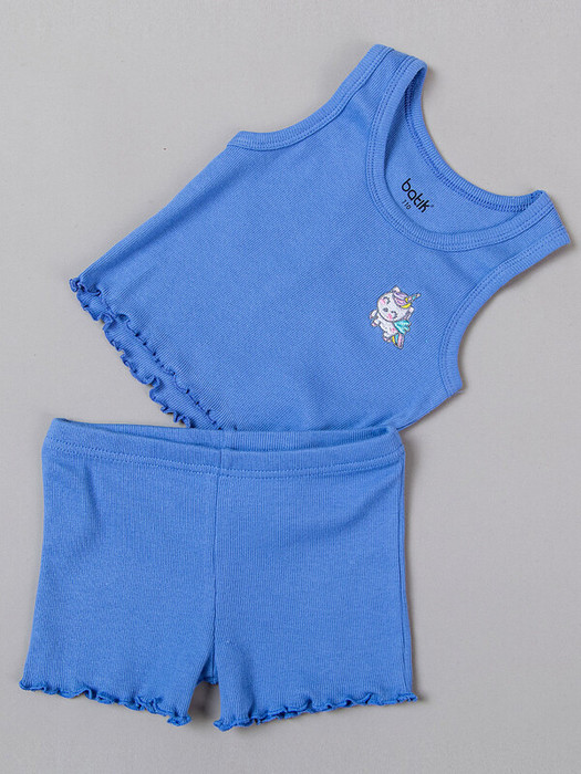 Комплект трикотажный для девочки из кашкорсе: майка-топ и шорты. Комплект одежды в синем цвете подойдет на жаркое лето. Мягкий трикотажный материал является гипоаллергенным, в такой одежде не будет жарко, поэтому она отлично подойдет для детского сада и повседневной носки. Майка на широких лямках и шорты на мягкой резинке станут отличным дополнением повседневного гардероба девочки.Характеристики:Ткань: Кашкорсе 95% хлопок 5% эластанПроизводитель: batik
