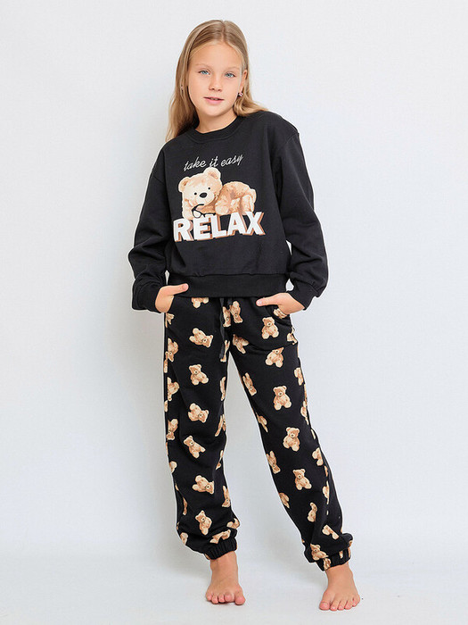 Пижама для девочки трикотажная из футера: свитшот с длинным рукавом и брюки. Детская пижама сшита из 100% натурального гипоаллергенного хлопка. Пижама подойдет для сна дома и в детском саду, а также можно носить как домашний костюм. Черная расцветка и принт в виде мишек. Брюки с карманами на резинке и завязках.Характеристики:Материал: Футер 2х нитка с начесом пенье 100% хлопокПроизводитель: batik