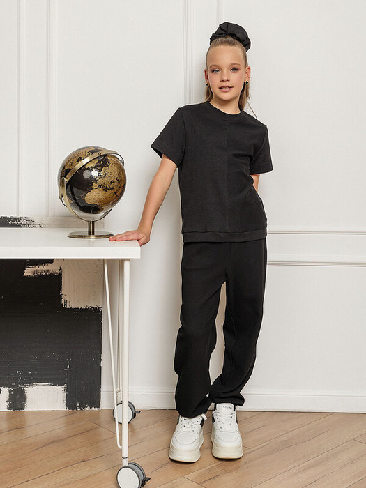 Топ черный из фактурного трикотажного полотна с короткими рукавами. На передней и задней части модели скомбинированы разные направления узора. Притачной пояс. Топ можно сочетать с любыми вещами. Идеально подойдет как для спортивного стиля, так и для расслабленного школьного образа.Характеристики:Ткань: хлопок 79%, полиэстер 18%, спандекс 3%Производитель: batik