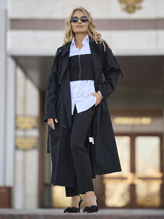 Тренч Бранка - классический черный тренч из плащевой ткани с водоотталкивающей пропиткой. Внутренняя отделка выполнена в монохромных цветах, гармонирующих с тканью верха. Обладает идеальной посадкой и свободным кроем. Рукав типа реглан обеспечивает свободу движений. Удобные карманы имеют оптимальный размер.