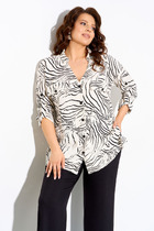 Оригинальная блузка из приятной струящейся ткани может превратить обычный повседневный костюм в праздничный наряд, а съемный цветок придает образу очарование и актуальность. Блузка прямого силуэта с застежкой на спине на одну пуговицу и навесную петлю. Вырез горловины оформлен небольшим отложным воротником со стойкой. Спинка без особенностей. Рукав втачной длинный со сборкой и манжетой по низу. Застежка манжеты на 2-е петли и пуговицы.