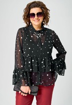 Блузка рубашечного типа, свободного силуэта, со спущенной линией плеча. По переду застежка на петли пуговицы. Рукава обьемные (буфы), по низу рукава резинка.