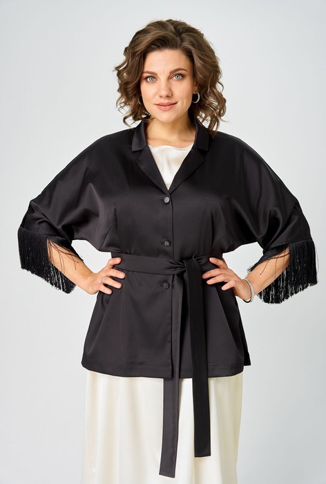 Блузка кимоно для женщин – это идеальный вечерний наряд, который добавит шарма и элегантности вашему образу. Она сочетает в себе стиль кимоно с классическими чертами жакета за счёт формы горловины и воротника. Пояс, входящий в комплект, позволяет акцентировать талию и придать блузке дополнительный шик. Свободный крой придает ей особую изысканность, а бахрома по низу рукавов делает еще более эффектной. Эта модная и стильная блузка кимоно подойдет для различных мероприятий, она необычайно универсальна и легко вписывается в любую ситуацию.