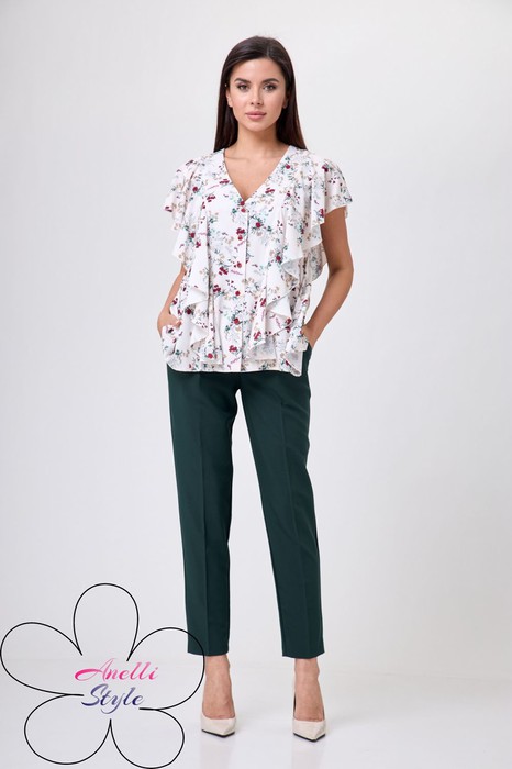 Блузка прямого силуэта, длиной до бедра. V-образный вырез по переду. По переду идет рюша переходящая в рукав. Спинка разрезная по талии, волан на сборке. По переду декоративная планка с пуговицами. Актуальна для офиса или прогулок, в ней будете выглядеть свежо и женственно. Блуза снята с брюками 518 зеленого цвета Anelli Laurel.