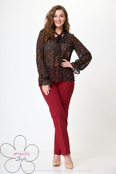 Блуза женская прямого кроя, длиной до середины бедра. Рукав длинный, низ на резинке. По переду V-образный вырез, с бантом. Блузка отличный вариант вне сезона, отлично будет сидеть на любой фигуре. Вся необходимая информация о производителе указана на этикетке. При сьемке в образе использованы брюки бренда ANELLIstyle М - 895