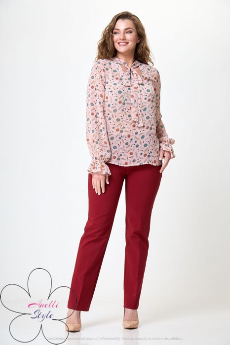 Блуза женская прямого кроя, длиной до середины бедра. Рукав длинный, низ на резинке. По переду V-образный вырез, с бантом. Блузка отличный вариант вне сезона, отлично будет сидеть на любой фигуре.    Вся необходимая информация о производителе указана на этикетке. При сьемке в образе использованы брюки бренда ANELLIstyle М - 895