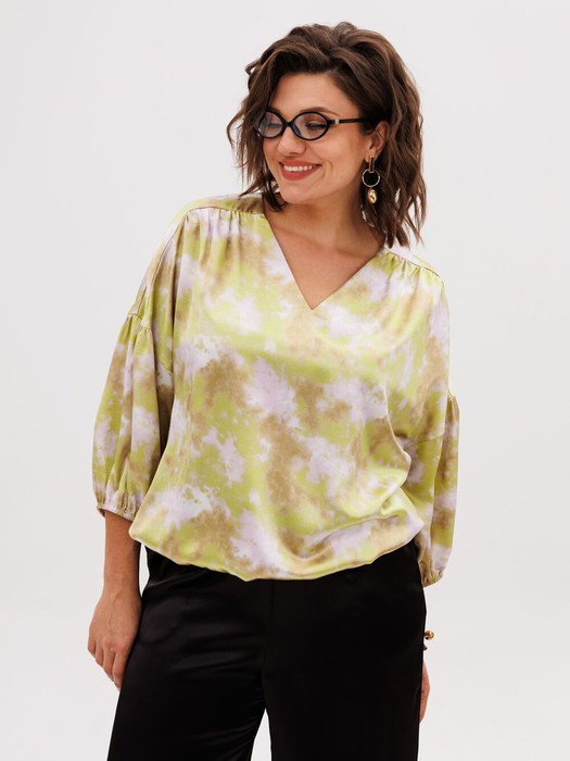 Ее свободный крой и мягкие спущенные плечи создают основу для невесомого силуэта. Глубокий V-образный вырез придает образу изысканность, а изящная кокетка добавляет художественный штрих. Рукав-кимано, собранный на резинке, мягко облегает запястье, предлагая вам варьировать его длину.
