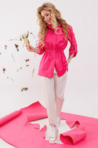 Свободный покрой, втачной рукав на манжете и патой   регулировки длины рукава, V-образный вырез и нетрадиционная его обработка контрастной и эластичной тесьмой, по переду односторонняя складка от низа горловины.