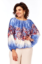 Блузка свободного кроя, выполнена из полупаразрачного полотна белого цвета. Прмой свободный крой, рукав широкий вточной, низ присборен на фигурную узкую манжету, V-образный вырез, лиф отрезной по лини талии, застежка центральная на шнурки-завязки. Длина по спинке 62см, длина рукава 61см.
