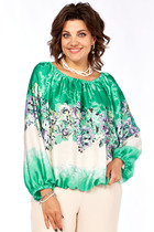 Блуза свободного кроя. Выполнена из легкого натурального полотна- рами . По переду и по задней части фигурная кокетка. По переду на кокетке тесьма-завязки (завязки функциональные). Рукав втачной, немного спущен. Низ рукава на резинкей. Длина по спинке 63 см, длина рукава 52 см.