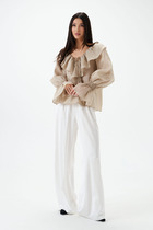Блузка свободного кроя, выполнена из лёгкого натурального полотна розового цвета ; рами. Воротник рубашечного типа, застежка центральная на петли пуговички, крой рукава летучая мышь. Низ изделия и рукава декорированы воланом из основной ткани изделия. Длина по спинке с учетом волана - 73 см. Длина рукава от горловины - 60 см.