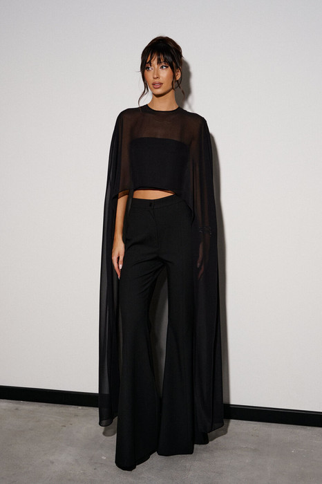 Блузон женский прямого силуэта, выполнен из легкого полотна черного цвета. Характеристики: горловина круглая, по спинке с разрезом, застегивающимся на петлю-пуговицу, укороченный спереди и длинный по спинке. Длина по спинке 137 см, длина по переду 35 см