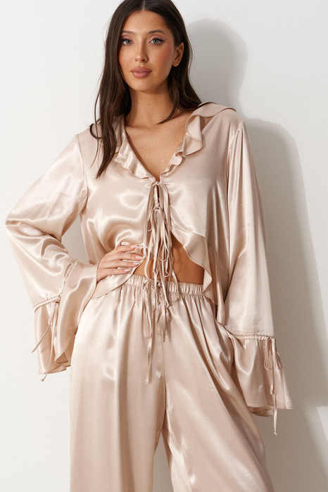 Блуза свободного кроя, выполнена из мягкого струящейся ткани телесного цвета. Характеристика: вырез горловины V-образный, с воланом по всей длине (переходит на спинку), центарльная застежка на завязки, рукав втачной, спущенный, по низу волан с кулиской, низ блузы по переду фигурный, с воланом переходящим на спинку. Длина рукава от линии края горловины 84 см. Длина по центру спинки 71 см.